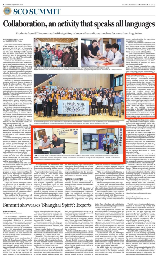 9月1日,《CHINA DAILY》刊发文章《Collaboration,an activity that speaks all languages Students from SCO countries find that getting to know other cultures involves far morn than linguistics》,其中报道了乌兹别克斯坦鲁班工坊和2025年世界职业院校技能大赛中亚赛区(乌兹别克斯坦)赛事。