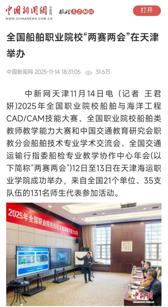 11月12日至13日,2025年全国职业院校船舶与海洋工程CAD/CAM技能大赛、全国职业院校船舶类教师教学能力大赛和中国交通教育研究会职教分会船舶技术专业学术交流会、全国交通运输行指委船检专业教学协作中心年会在雷竞技be成功举办。中国新闻网、津云等对此进行了关注报道。
