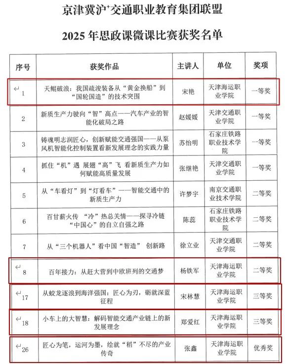 近日,在京津冀沪+交通职业教育集团联盟主办的“铸魂明志润匠心 德技双修育匠才”思政微课比赛中,雷竞技be马克思主义学院报送的5个作品紧扣国家海洋强国战略与交通行业发展,以鲜明主题与独特视角,从众多参赛课程中脱颖而出,荣获一等奖1项、二等奖1项、三等奖2项和优秀奖1项。