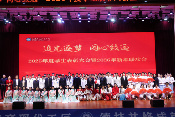 大会在充满新年氛围的开场舞中拉开帷幕。学院院长于忠武致新年贺词。他全面回顾了2025年学院在党建引领、“双高计划”建设、人才培养、国际交流、服务社会等方面取得的丰硕成果,对全体师生的辛勤付出表示衷心感谢,并展望2026年发展蓝图,激励全院师生在新起点上肩负使命、接续奋斗,奋力谱写服务教育强国、海洋强国战略的新篇章。