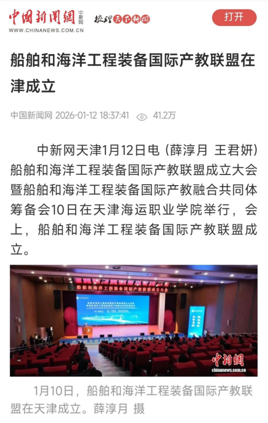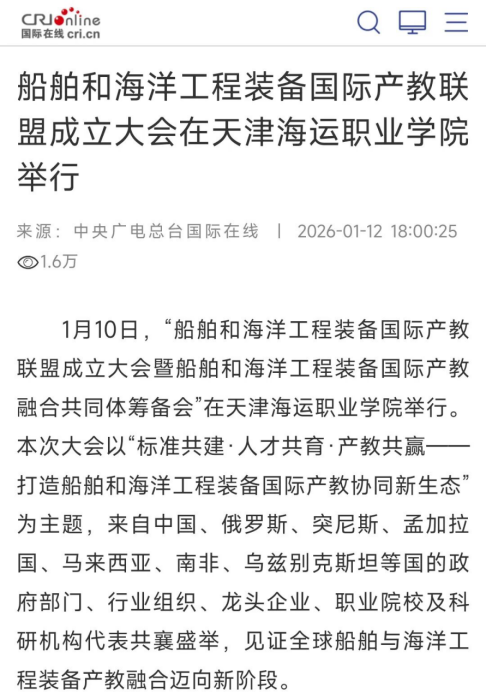 1月10日,船舶和海洋工程装备国际产教联盟在雷竞技be成立。联盟首批成员达76家单位,覆盖亚、欧、非三大洲,形成政行企校研“五位一体”合作体系。光明日报、中国新闻网和中央广电总台国际在线对此进行了关注报道。
