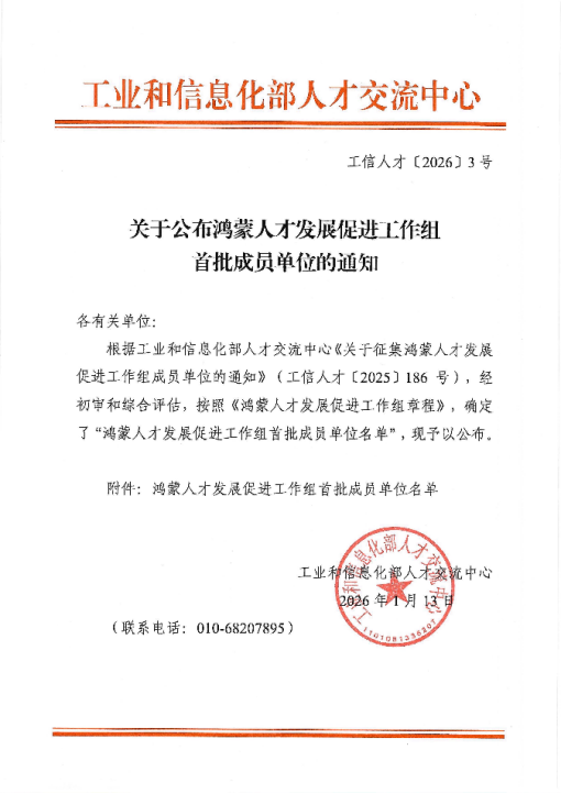 鸿蒙人才发展促进工作组由工业和信息化部人才交流中心、教育部学生服务与素质发展中心牵头,联合华为技术有限公司、中软国际、软通动力等行业领军企业,以及北京理工大学、深圳职业技术大学等高校共同发起。其目的在于搭建政、校、企协同育人平台,推动鸿蒙操作系统生态人才培养的标准化、规模化发展,助力数字经济与实体经济的深度融合。