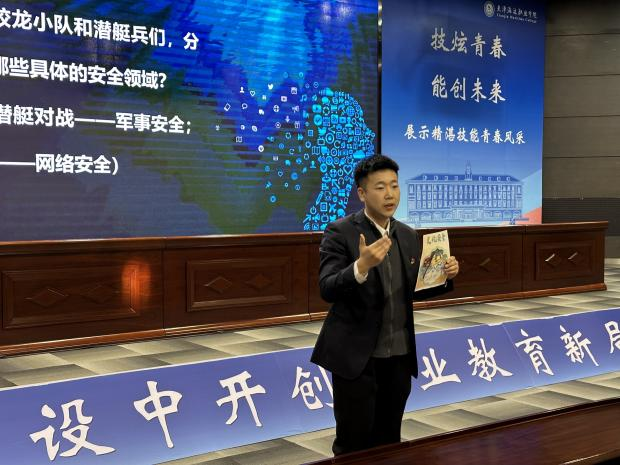 随后,同学们立足所学专业,把澎湃心潮化为守护国家安全的青春承诺:“我驾驶的每一海里,守护的都是国家经济的海上命脉。”“我检修的每一个零件,夯实的都是海洋强国最坚实的根基。”……宣言虽简,却饱含海运学子的时代担当。课程最后,全体师生庄严宣誓:“捍卫海疆,守护深蓝,为建设海洋强国贡献青春力量!”誓言铮铮响彻会场,把整场活动推向高潮。