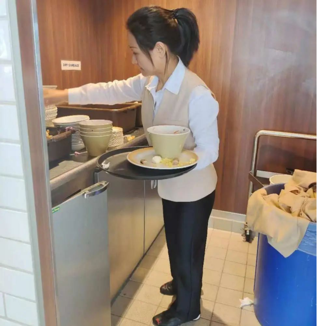 参训教师团队在“海洋赞礼号”邮轮观摩了国际化服务场景,参与船员培训课程设计研讨,同时进行餐厅厨房岗位实践。通过参加厨房与餐厅实际操作培训,参训教师深化“3-Bucket清洁系统”标准化培训与食品卫生管理的学习,深入了解了船员所需掌握的食材温度检测、餐具三重消毒及高频接触领域的深度清洁规范。
